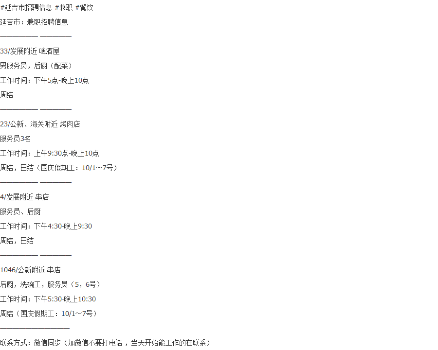 - 32 今天 09:03 10/1日 兼职招聘信息:服务员,后厨