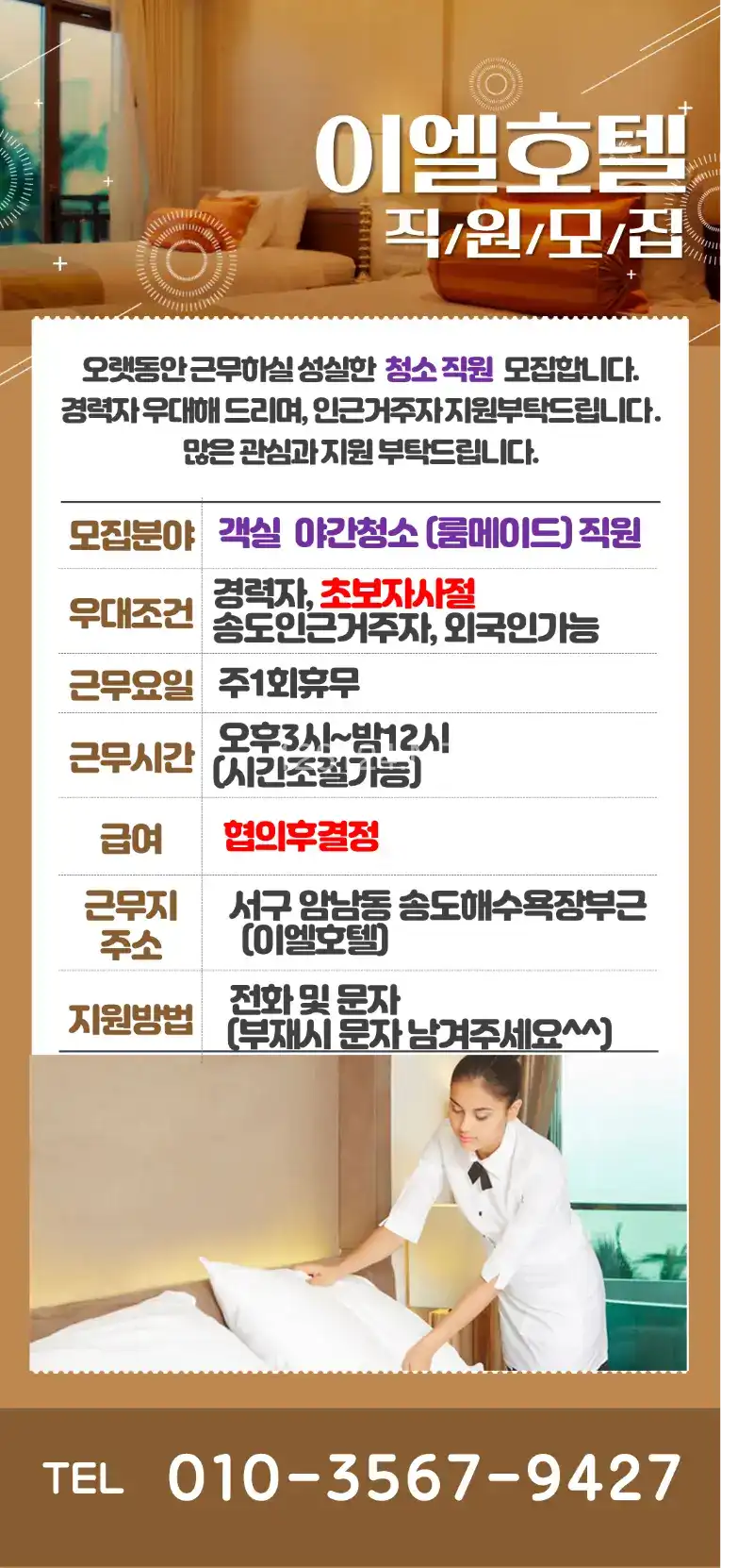 [부산 이엘호텔] 객실 야간 청소직원 모집 경력자 송도인근거주자 외국인가능