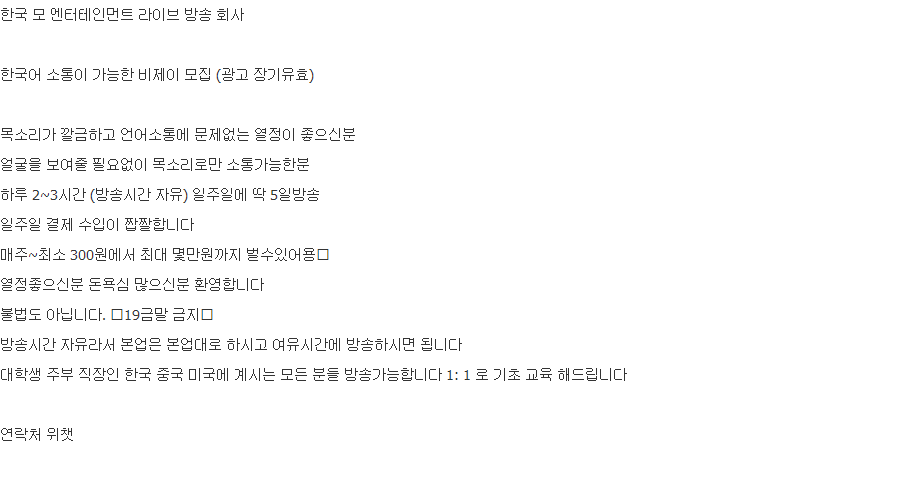 - 2641 25.10.01 조선족 主播 모집합니다,월급은 현재 오전 타임 3시간 하는분 10일정도 하루 평균 500원