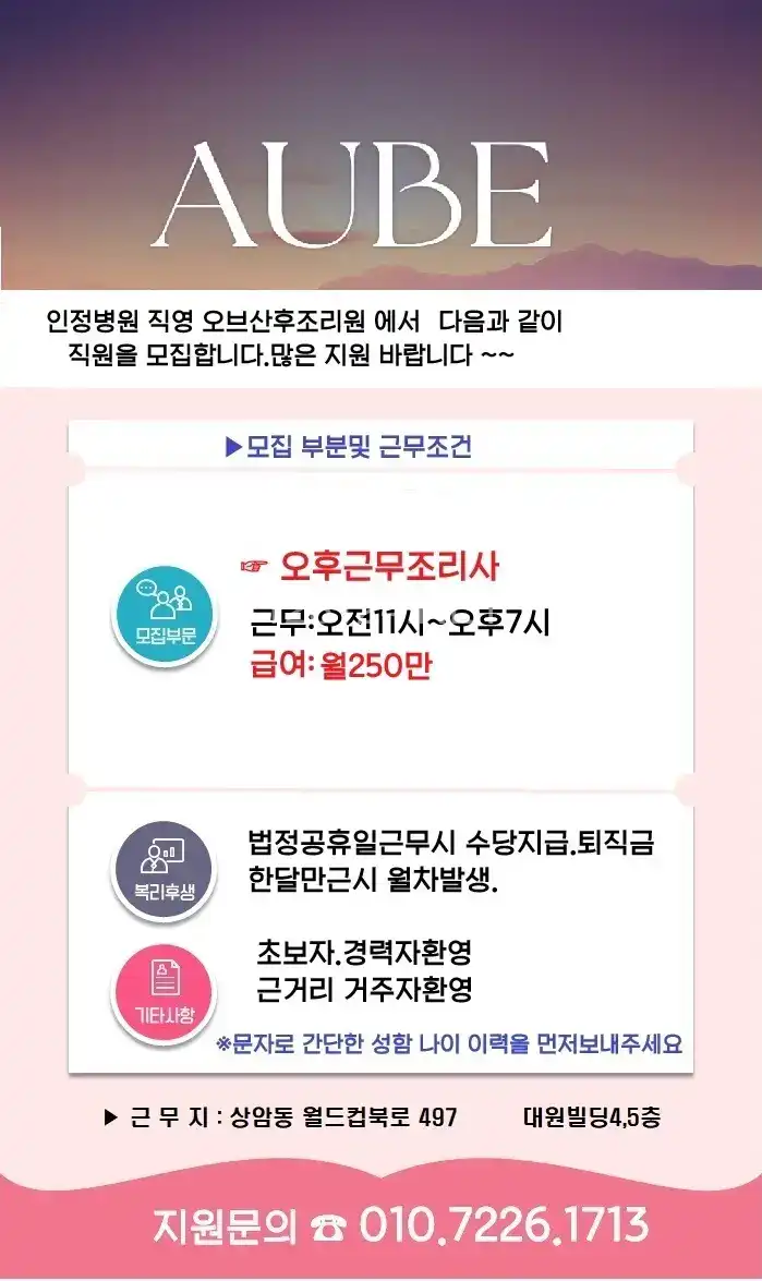 [추천]오후근무조리사 오전11시~오후7시 월250만