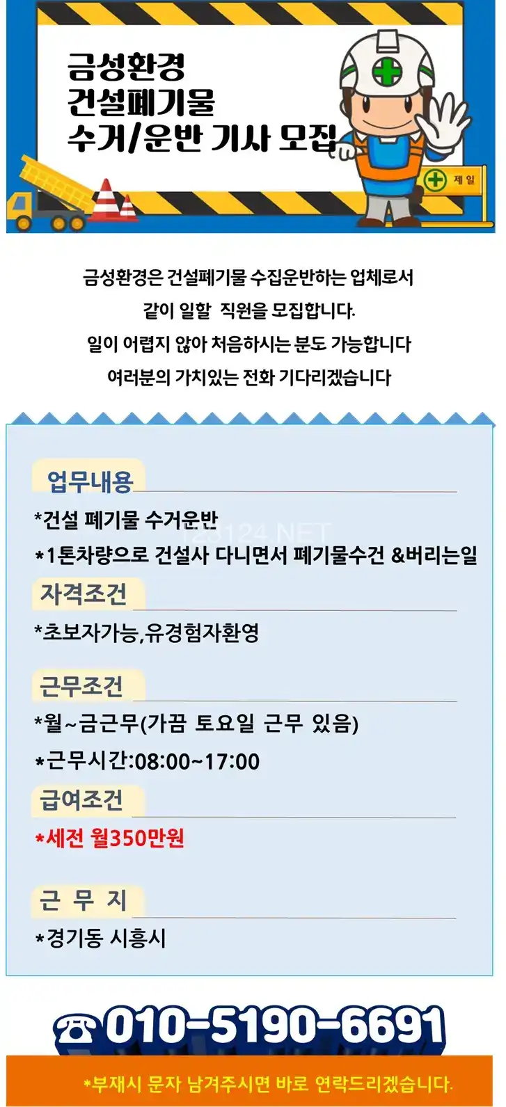 1톤차량으로 건설사 다니면서 폐기물 수거,운반하실 직원 구함