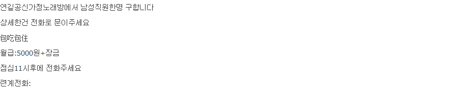 - 369 今天 14:56 연길시내 새로오픈한모노래방에서 남성복무원구합니다