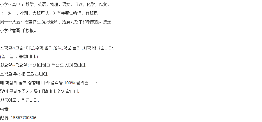 - 2150 今天 15:38 한국어/중국어/영어를 가르칩니다.教韩语/汉语/英语/练书法