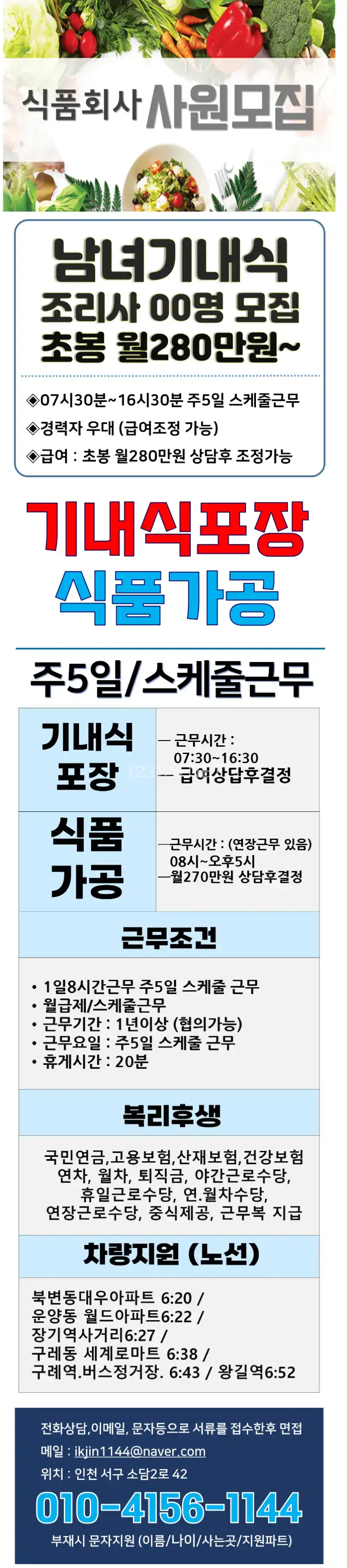 [신규오픈]조리사초봉280만원식품가공직 월270만원/식품회사기네식포장직,주5일근무스케줄근무