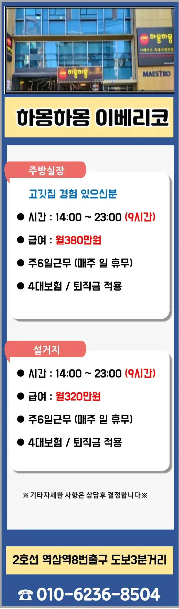 주방실장 (9시간근무) 월380만 / 설거지 (9시간근무) 월320만원/매주일요일 휴무