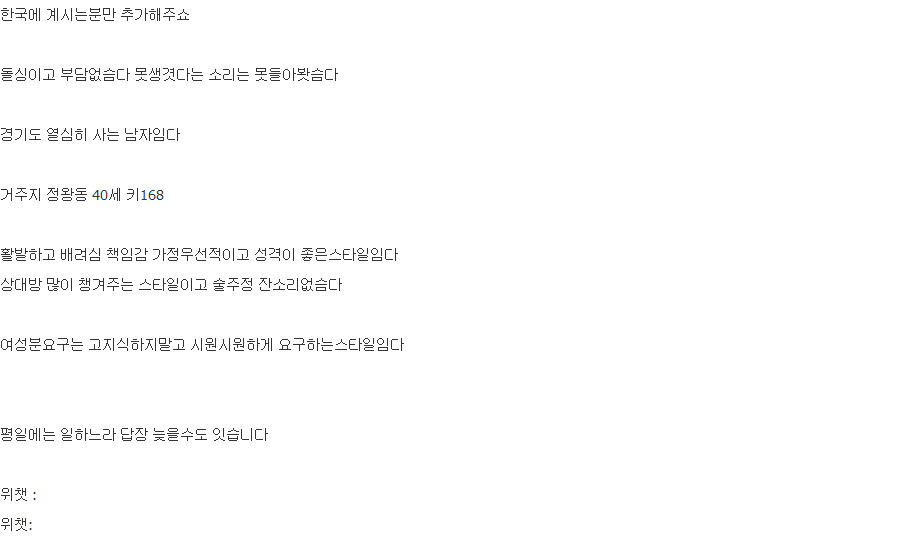 - 654 今天 12:34 가정적인 남자를 좋아하는 여자분이면 추가해주세요.남