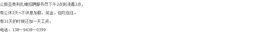 - 18 25.10.09 公新亚美利扎啤招聘服务员下午2点到凌晨2点,有公休2天+不休息加薪,奖金,包吃包住。有31天的时候还