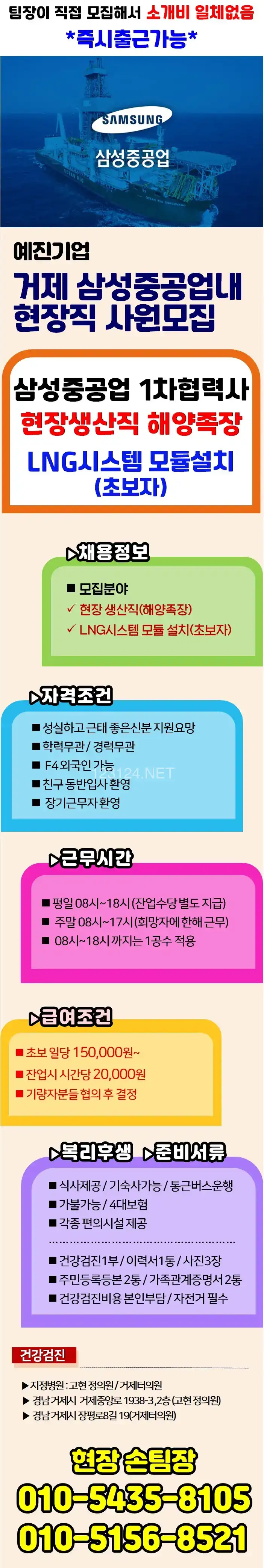 즉시출근 [가불가능] 거제 조선소 삼성중공업/족장/기숙사/외국인/숙식제공/초보,동반입사가능