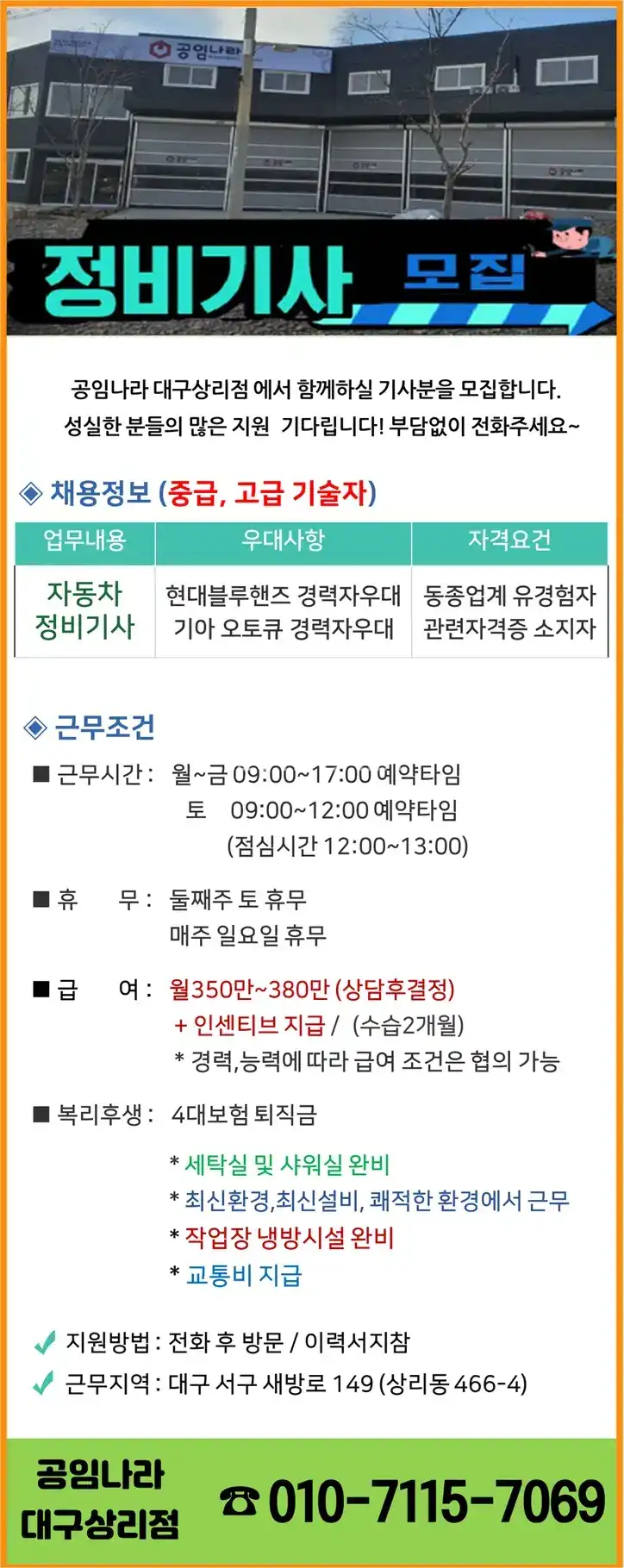 공임나라 월350~380만+인센티브 [정비기사 중급,고급기술자] 교통비지급,작업장냉방시설완