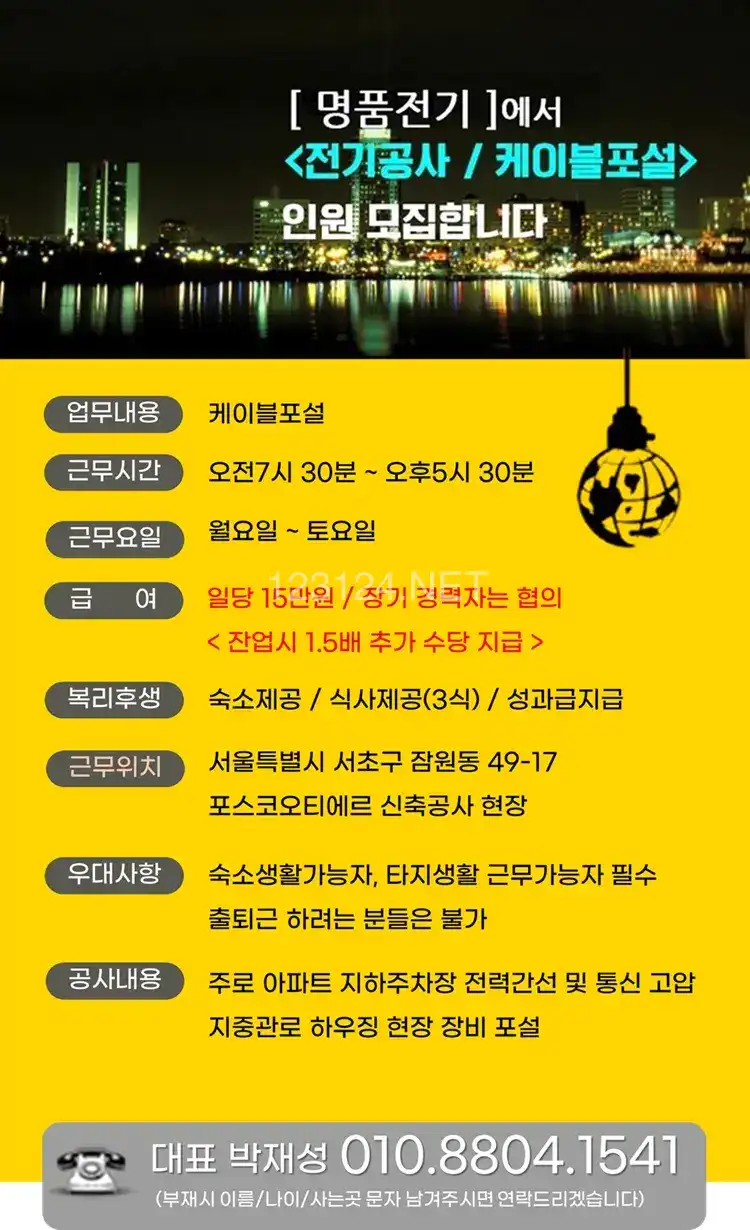 일당15만원~숙소제공 [전기/케이블포설] 숙박,숙식제공/잔업시 1.5배 지급초보가능
