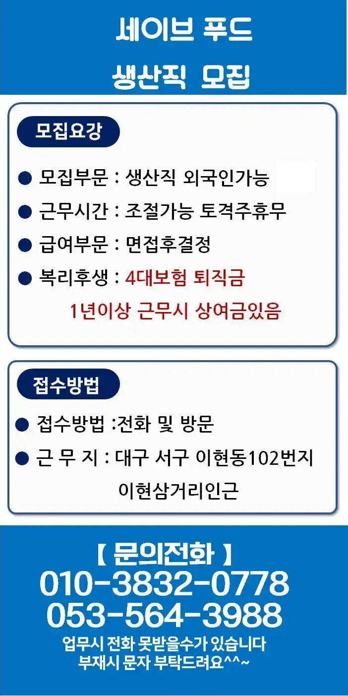 [세이브 푸드] 생산직 모집(외국인 가능)/배송기사 모집