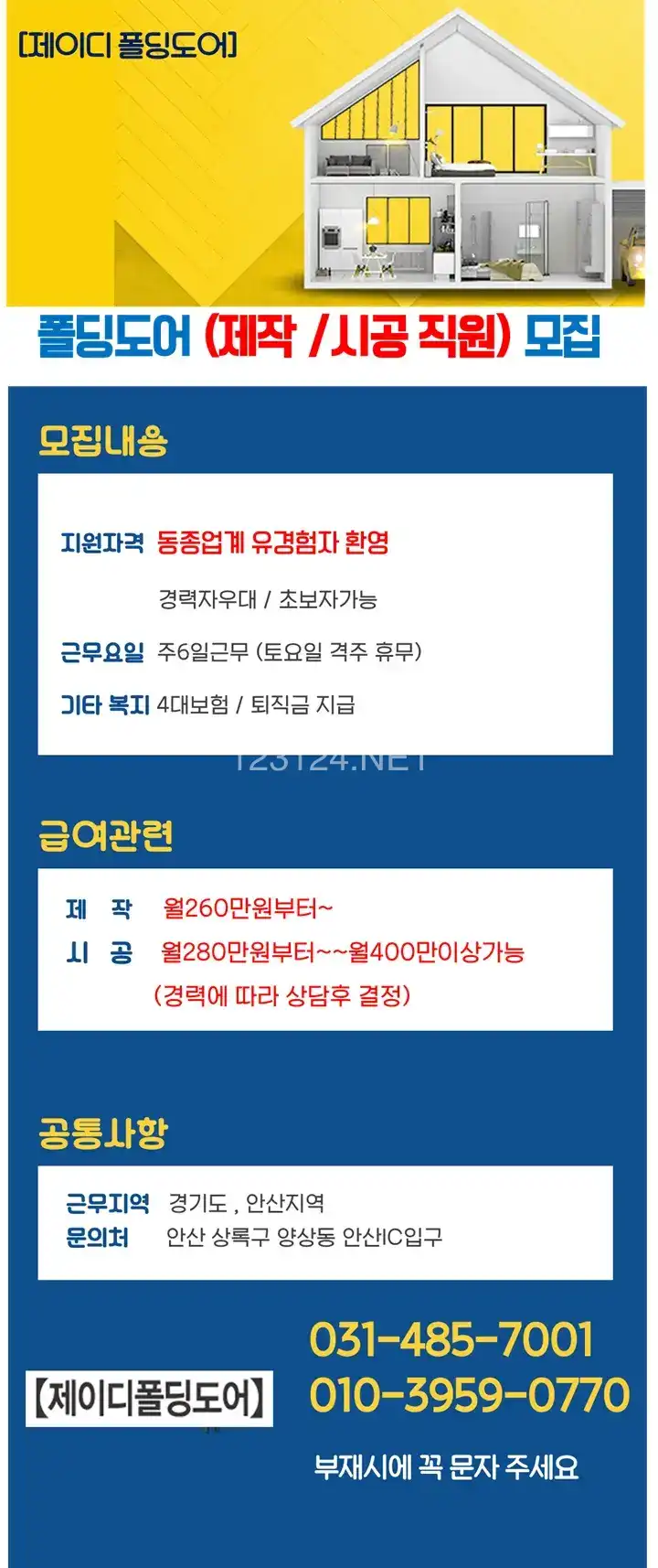 [급여260부터~400만가능] 폴딩도어 제작,시공직원모집 초보자가능 경력우대 토요격주휴무