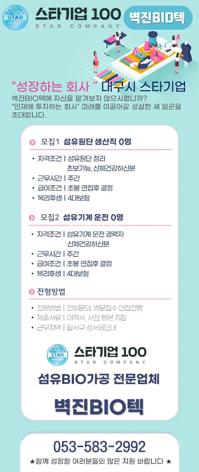 (대구시 스타기업/섬유BIO가공 전문업체) 섬유원단 생산직 / 섬유기계 운전직 각 0명