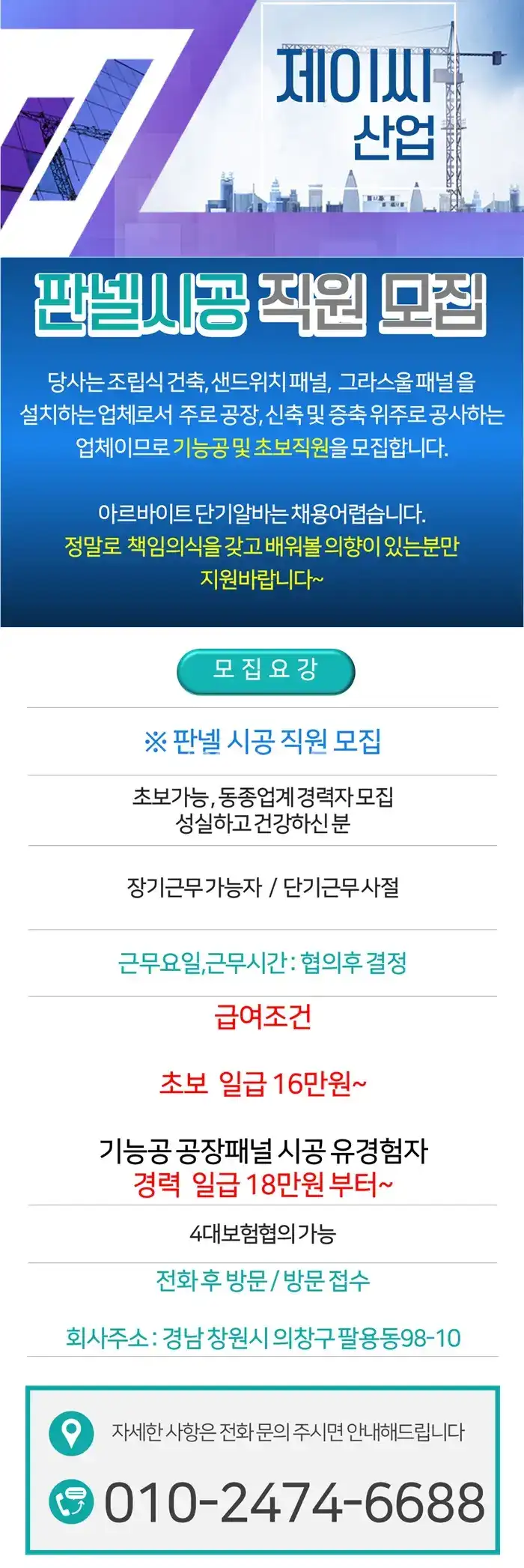 일급~18만원/조립식 판넬시공 기능공 및 초보직원 구함/경력자우대