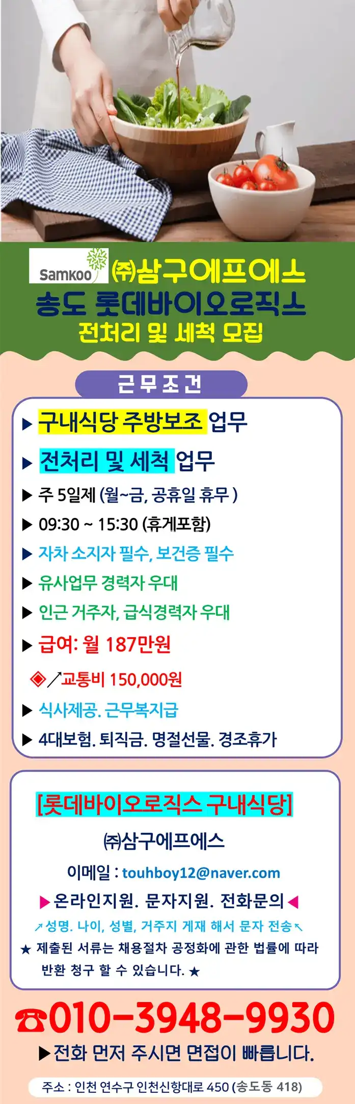 [교통비15만] 인천 송도동 롯데바이오로직스[직원식당 전처리 및세척 모집]주5일 월187만