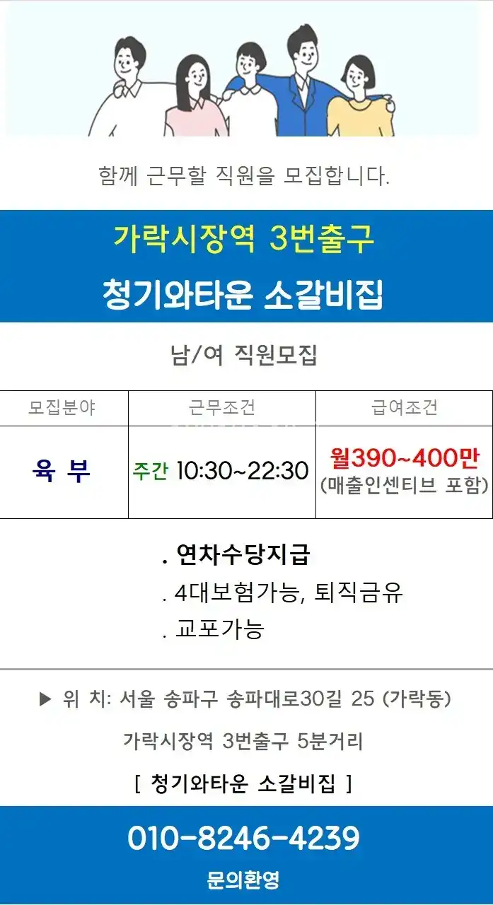 [월390~400만] 육부 모집 가락동 가락시장역 5분거리