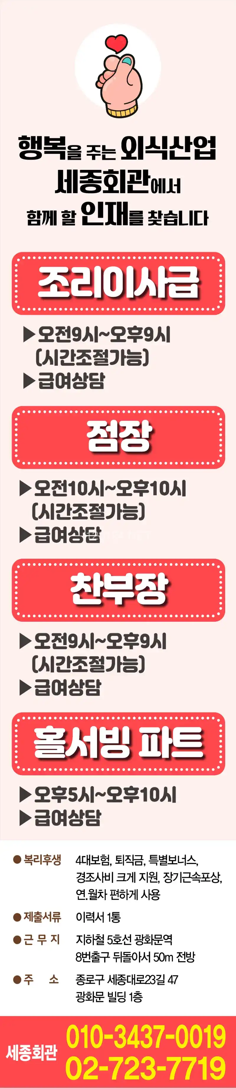 [행복을 주는 외식업] 조리이사급/ 점장/ 찬부장/ 홀 오후파트각0명모집 급여상담
