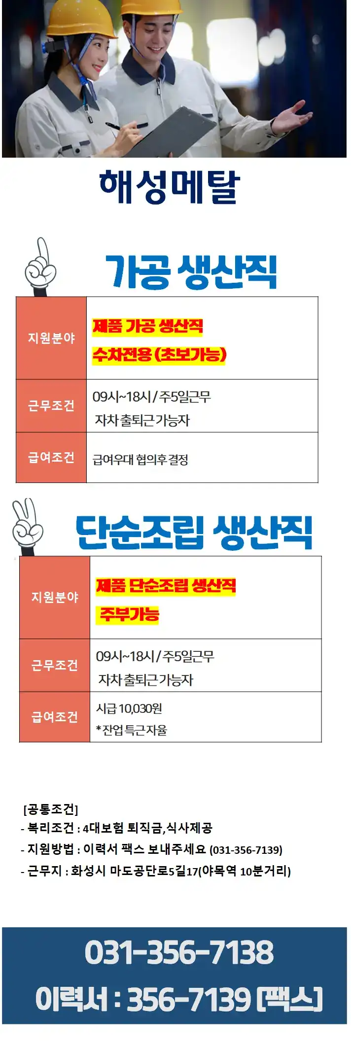 주5일 [ 가공생산직 / 단순조립 생산직 구함 주부가능] 초보가능 잔업및 특근 자율