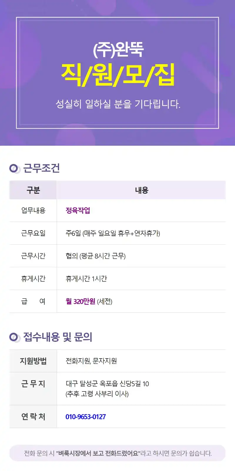 [월320만원] 정육작업 직원 모집 (대구 옥포읍 완뚝)