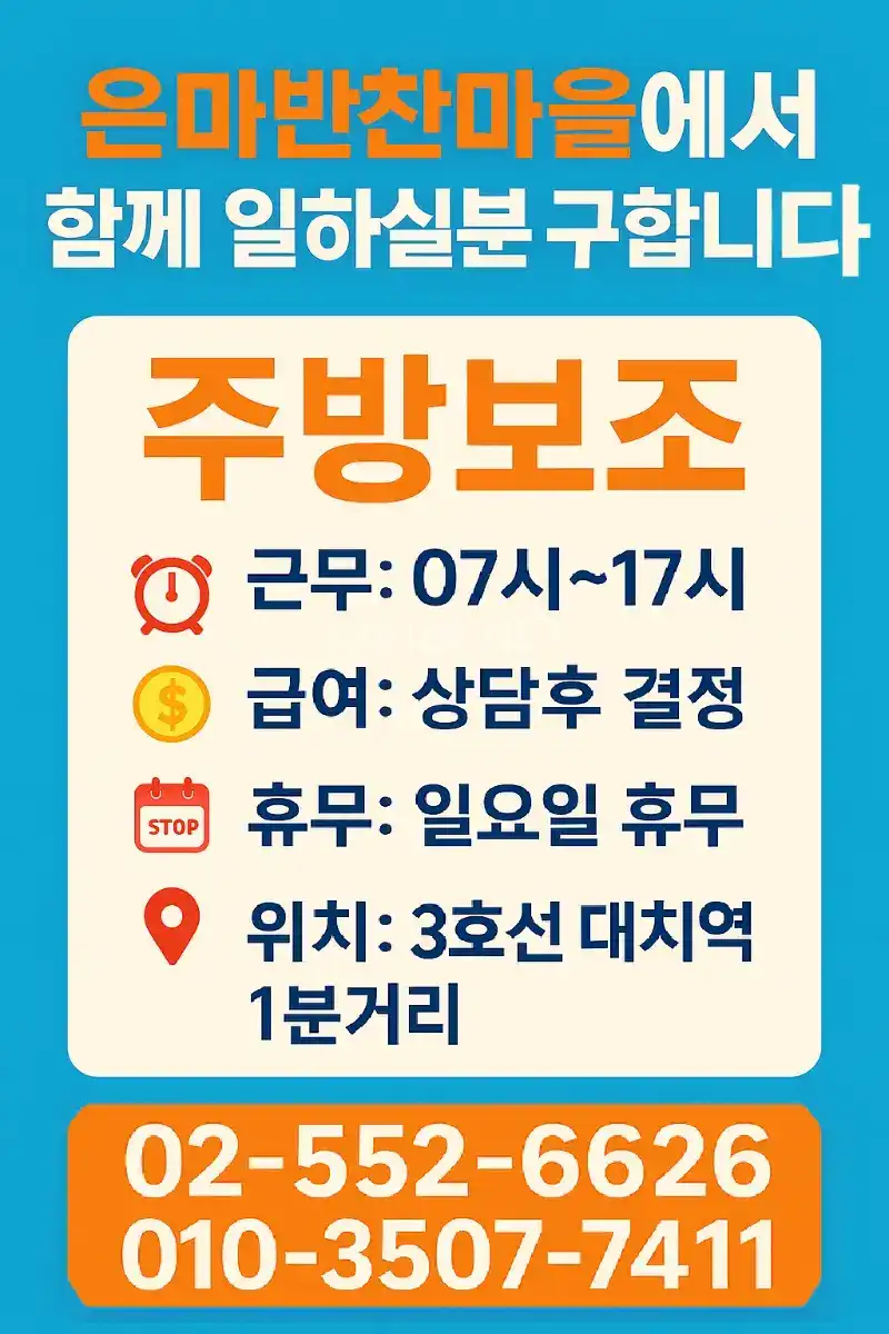 대치역1분거리 반찬가게 주방보조 구함/(일요일휴무)