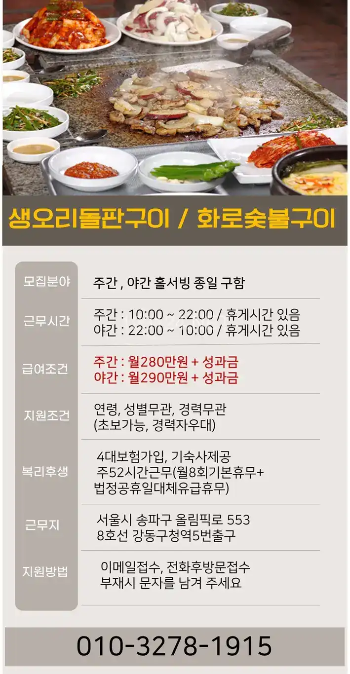 [생오리돌판구이/화로구이] 주간 야간 홀서빙 종일 구함 월8회휴무